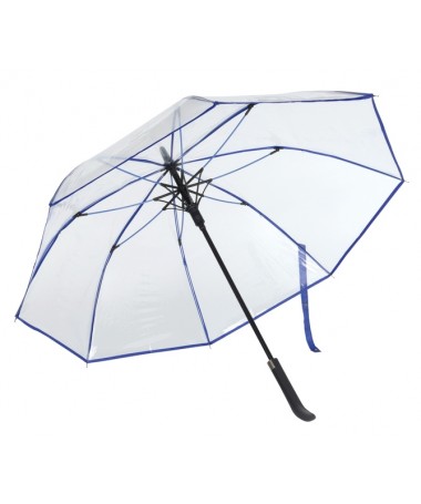 Ombrello automatico VIP: Asta in metallo, raggi in fibra di vetro colorati con punte in metallo, puntale in plastica, maniglia in plastica con pulsante di sblocco integrato, rivestimento in POE trasparente con profilo colorato, cinturino di chiusura con bottone