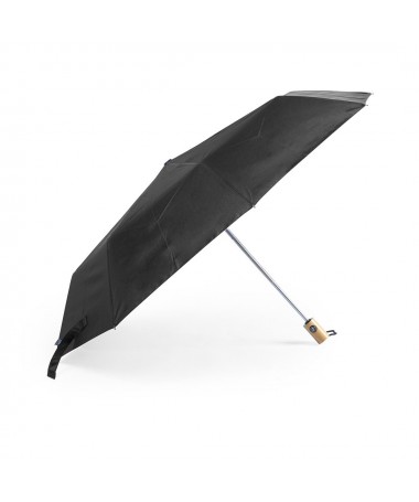 Ombrello pieghevole da 103cm di diametro, della linea natura. In materiale 190T RPET pongee, realizzato in plastica riciclata, per promuovere il riutilizzo dei rifiuti plastici e aiutare la sostenibilità del pianeta. Apertura e chiusura automatica, con meccanismo anti-vento e aste in fibra di vetro. Manico in bambù con bottone, distintivo RPET sull'etichetta e disponibile in una gamma di colori. Fodera RPET abbinata inclusa.