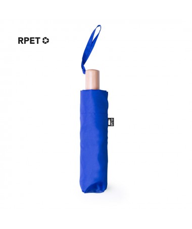 Ombrello pieghevole RPET con copertura coordinata. Canna, costole ed estremità in nero. Manico in legno naturale. Chiusura in velcro e apertura manuale. Diametro 95 cm.