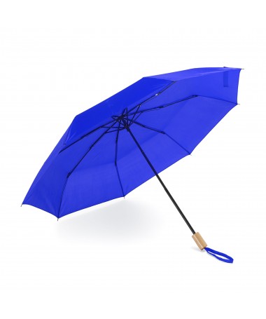 Ombrello pieghevole RPET con copertura coordinata. Canna, costole ed estremità in nero. Manico in legno naturale. Chiusura in velcro e apertura manuale. Diametro 95 cm.