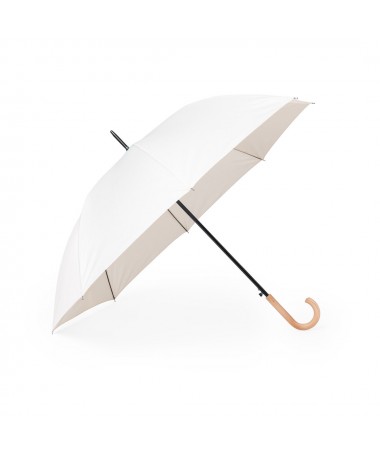 Ombrello a 8 pannelli da 120 cm di diametro, in resistente materiale pongee 190T con finitura naturale. Apertura automatica e meccanismo antivento. Con aste in fibra nera, manico in legno e cinghia con velcro.