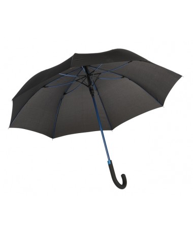 Ombrello classico automatico LAMBARDA: stecca in metallo, raggi in fibra di vetro, punte in metallo, manico curvo gommato con pulsante d`apertura integrato, rivestimento in poliestere-pongee con speciale copertura anti acqua e sporcizia, laccetto con chiusura a strappo