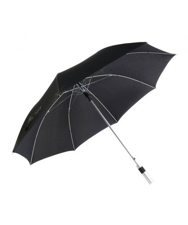Ombrello XL con manico, canna e finitura nera. Costole lunghe in fibra di vetro. Pulsante di apertura automatica. Impugnatura diritta in gomma EVA. Chiusura a velcro in tinta con il tessuto dell'ombrello. Diametro 130 .