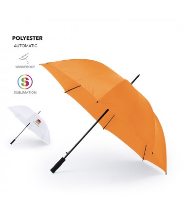 Ombrello a 8 pannelli taglia XL -130cm di diametro- in resistente poliestere. Apertura automatica, con sistema anti-vento e con aste in fibra nell'elegante color nero. Manico imbottito in EVA e chiusura in velcro. Disponibile in una vasta gamma di colori.<br />