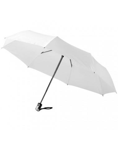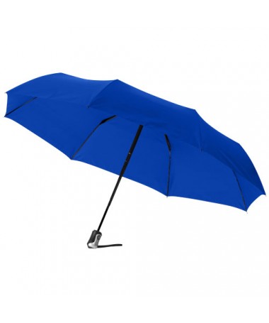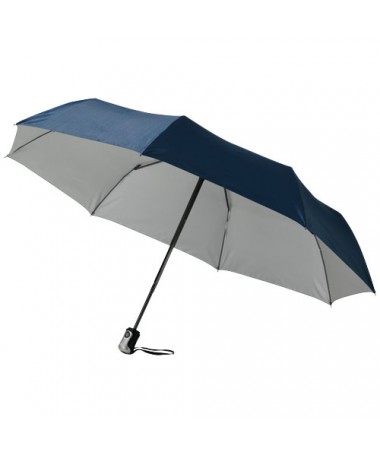 Ombrello 3 sezioni 21.5'' con pulsante di apertura e chiusura. Telaio e stecche in metallo e impugnatura in plastica. Fornito con custodia.