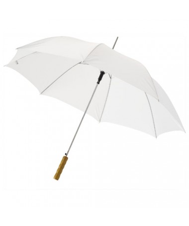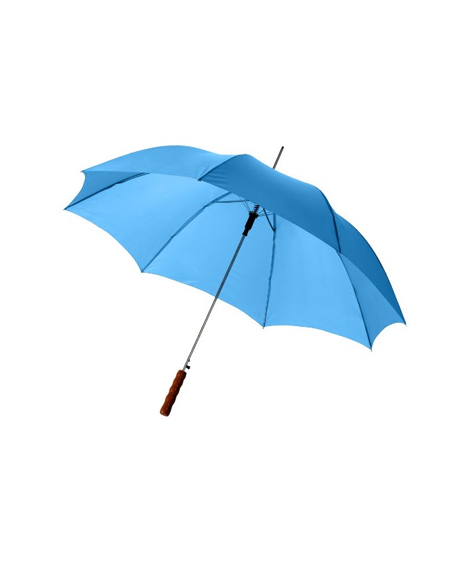 Ombrello automatico con aste e stecche in metallo e impugnatura in legno.