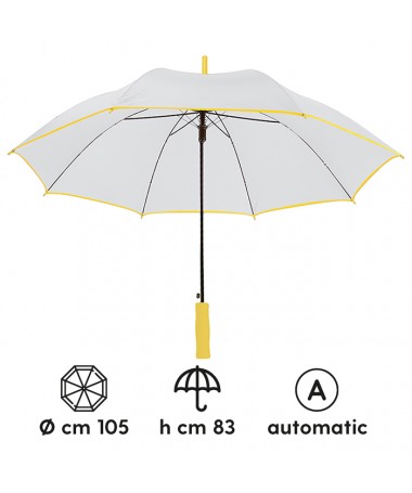 ombrello automatico sistema di apertura con meccanica di alta qualità struttura in fibra di vetro alta resistenza fusto in metallo puntale, manico in eva e bordino colorati chiusura con velcro