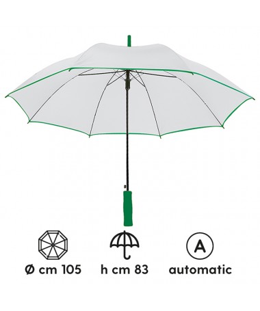 ombrello automatico sistema di apertura con meccanica di alta qualità struttura in fibra di vetro alta resistenza fusto in metallo puntale, manico in eva e bordino colorati chiusura con velcro