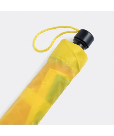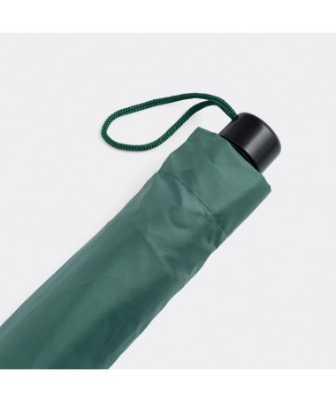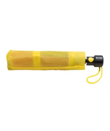 Ombrello tascabile automatico PRIMA, in custodia dal colore abbinato: stecca in metallo 3 parti, raggi e punte in metallo, manico in plastica nera con pulsante automatico dal colore abbinato e laccetto da polso, rivestimento in poliestere e laccio a strappo per chiusura