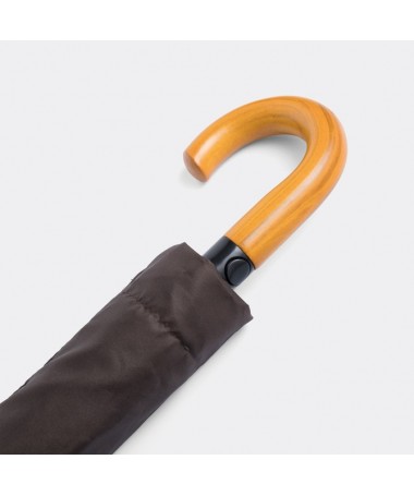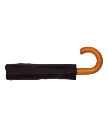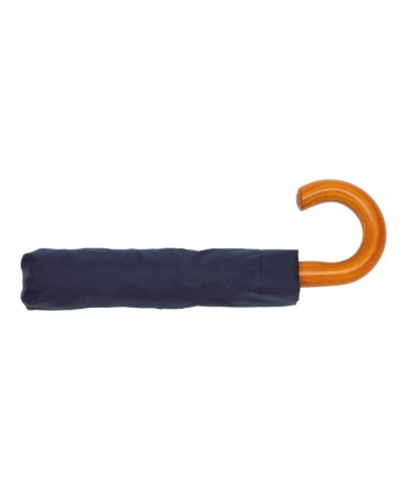 Ombrello tascabile da uomo automatico LORD: stecca in metallo 3-parti, raggi in fibra di vetro e metallo, impugnatura classica in legno, copertura e custodia in poliestere-pongee, con rivestimento particolarmente repellente all`acqua, laccetto di chiusura a strappo