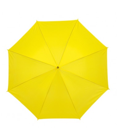 Ombrello classico automatico LIMBO: stecca e raggi in metallo, punte in plastica dal colore abbinato, manico in ottica legno, rivestimento in poliestere, laccio di chiusura a strappo