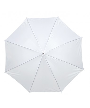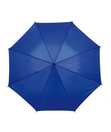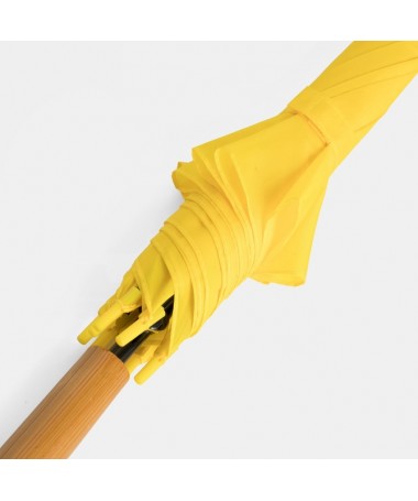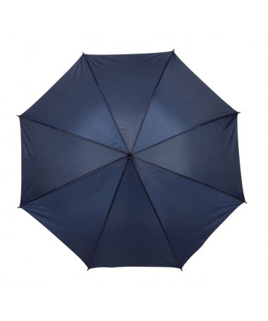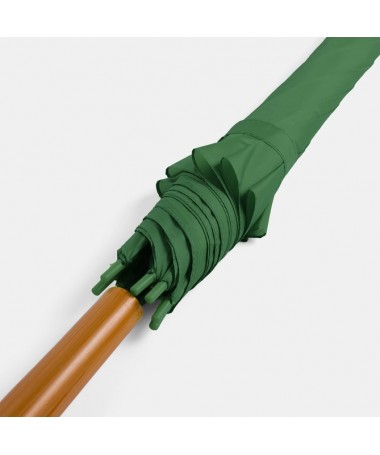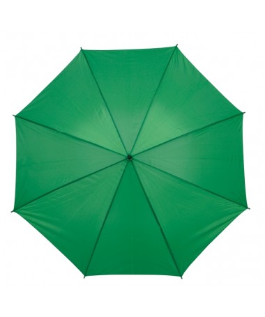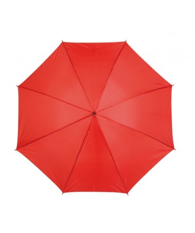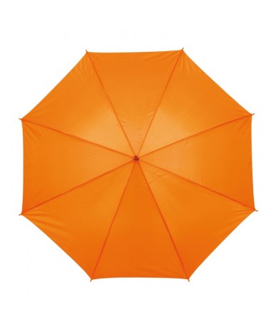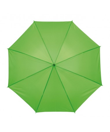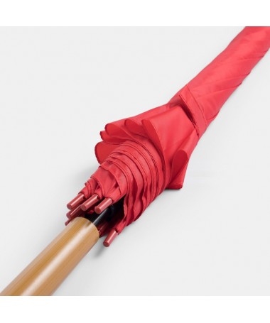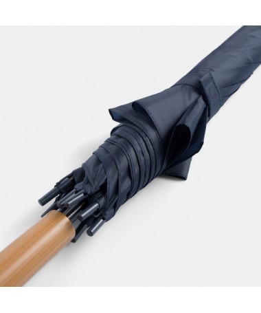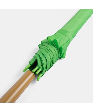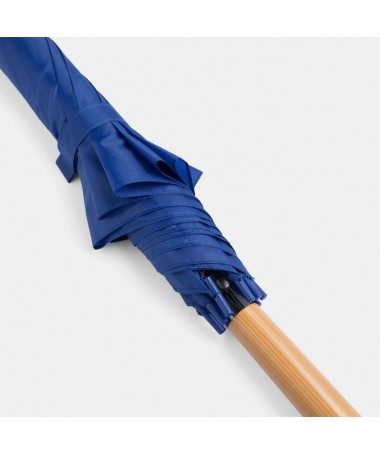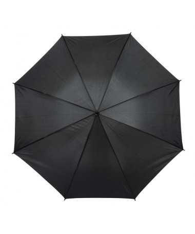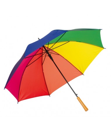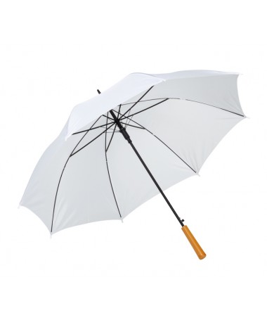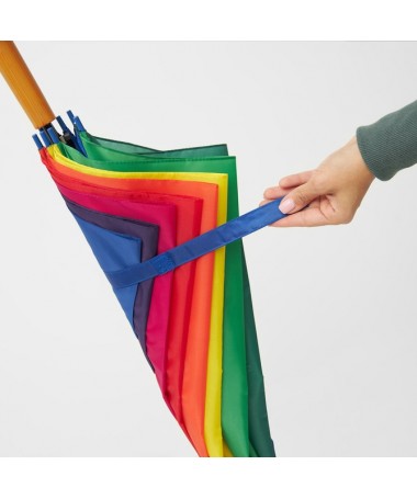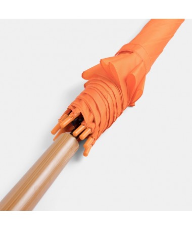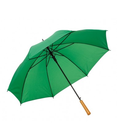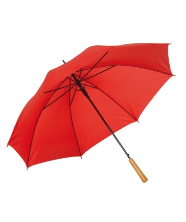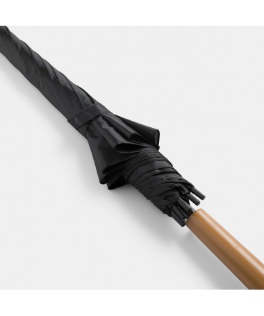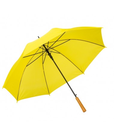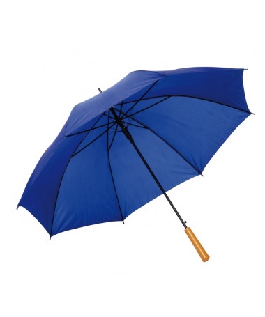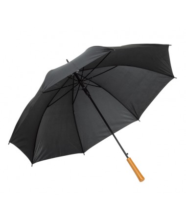 Ombrello classico automatico LIMBO: stecca e raggi in metallo, punte in plastica dal colore abbinato, manico in ottica legno, rivestimento in poliestere, laccio di chiusura a strappo