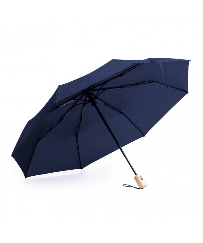 Ombrello con apertura e chiusura automatica in pongee 190T e custodia coordinata. Stecche e punte in nero con manico in bambù. Chiusura a velcro abbinata.