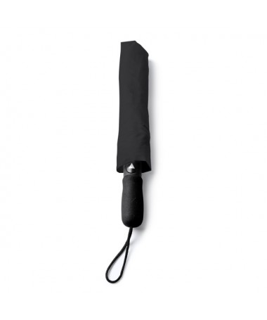 Ombrello richiudibile con apertura automatica. Tessuto pongee 190T con custodia abbinata. Manico in EVA e sezioni in metallo nero.