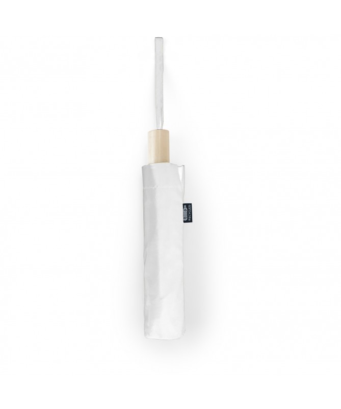 Ombrello pieghevole RPET con copertura coordinata. Canna, costole ed estremità in nero. Manico in legno naturale. Chiusura in velcro e apertura manuale. Diametro 95 cm.